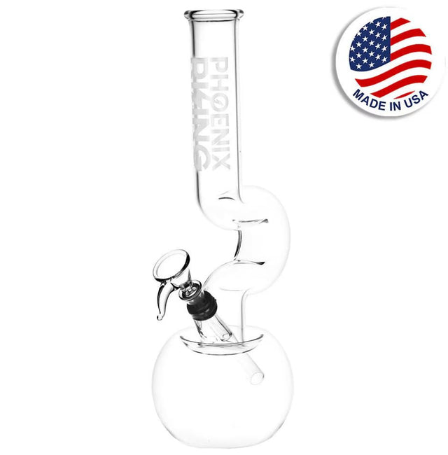 Made from worked glass right here in the USA, these Phoenix Rising Switchback Bubble Base Water Pipes are made with clear glass with a bubble base and a sunken neck with a switchback bend. These water pipes stand 11.25 inches (28.6cm) tall, and each pipe includes a grommet style herb slide connection and downstem.