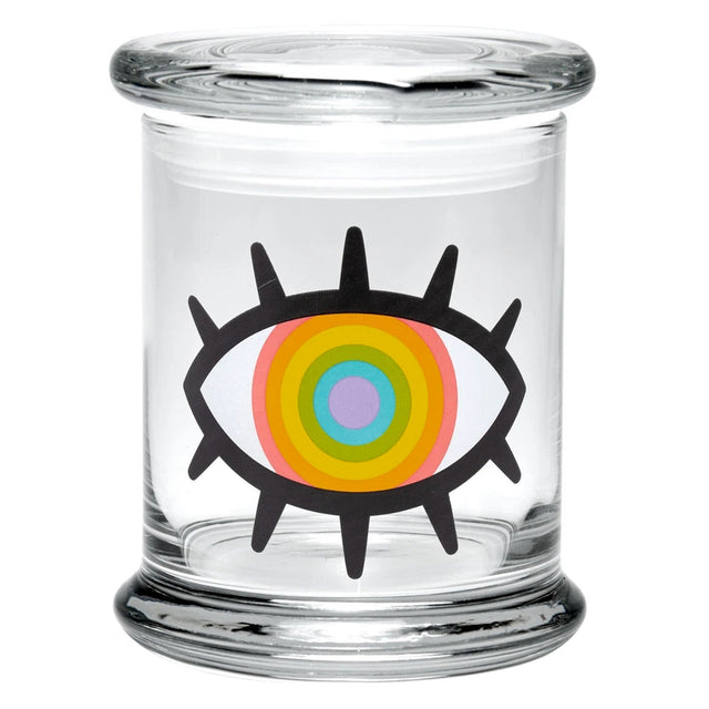 This jar features the playful and imaginative artwork of Wokeface. All of their artwork is positive, magical, and filled to the brim with colourful iconography. This design is equal parts cosmic dreamscape and daytime wonderland. There is a particular look that comes over a person right when they get super stoned; we love that look. The Rainbow Eye artwork captures that feeling of absolute bliss and confusion.